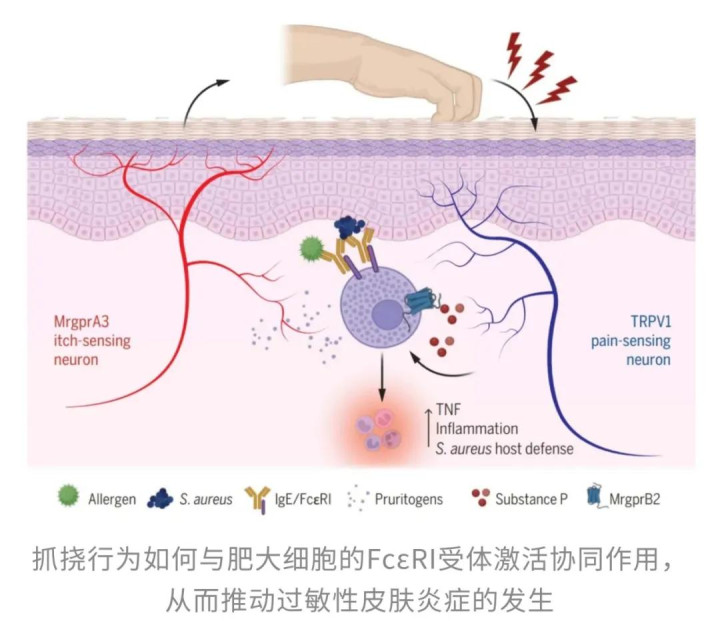 有意思的是,抓痒行为不仅仅是在“痒”上作文章,还会通过神经系统加剧炎症反应。当我们抓痒的时候,体内的痛觉神经元(特别是那些表达TRPV1受体的神经元)开始活跃起来,释放一种名为P物质(SP)的化学物质。这个P物质就像一个信号,它会启动一连串的免疫反应——直接激活肥大细胞,进一步释放出肿瘤坏死因子(TNF)等炎症因子,加重皮肤的红肿和溃烂,并且通过招募中性粒细胞来加剧瘙痒和炎症。