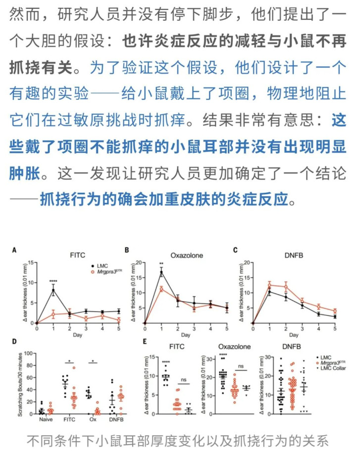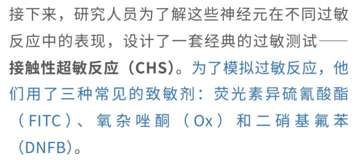 这些化学物质就像是过敏的“引子”,能激发小鼠的皮肤产生过敏反应。通过观察这些小鼠接触这些物质后的反应,研究人员可以看到,即便是“痒”信号的传递被“暂停”,这些神经元的消失是否会影响到小鼠的皮肤反应。