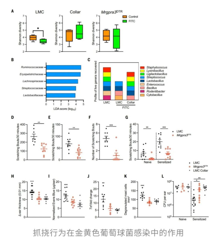 研究人员发现,当小鼠感染了超级细菌金黄色葡萄球菌时,适度的挠痒痒可以显著减少皮肤上的细菌数量。其原理很简单却又非常硬核:挠痒痒激活的TNF吸引了大量中性粒细胞来“清理”细菌,而反复的抓挠虽然会破坏皮肤屏障,但却使得细菌无法在皮肤上扎根,导致某些微生物多样性下降。实验结果表明,感染的小鼠在挠痒后,细菌载量减少了约90%!